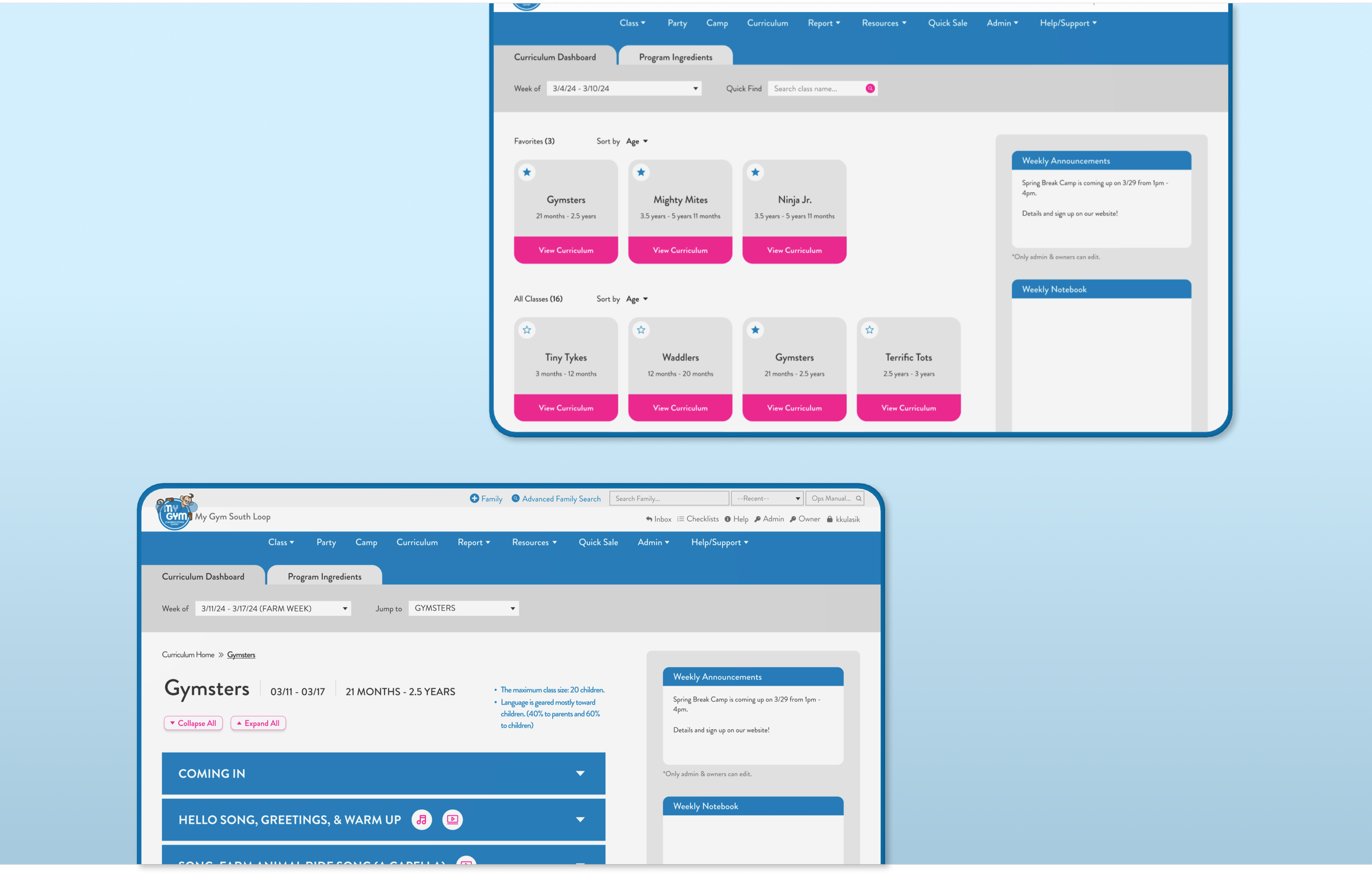 An overhaul of a segment of the intranet for a children’s fitness center. This redesign improves the employees’ experience of navigating and learning class curriculums.