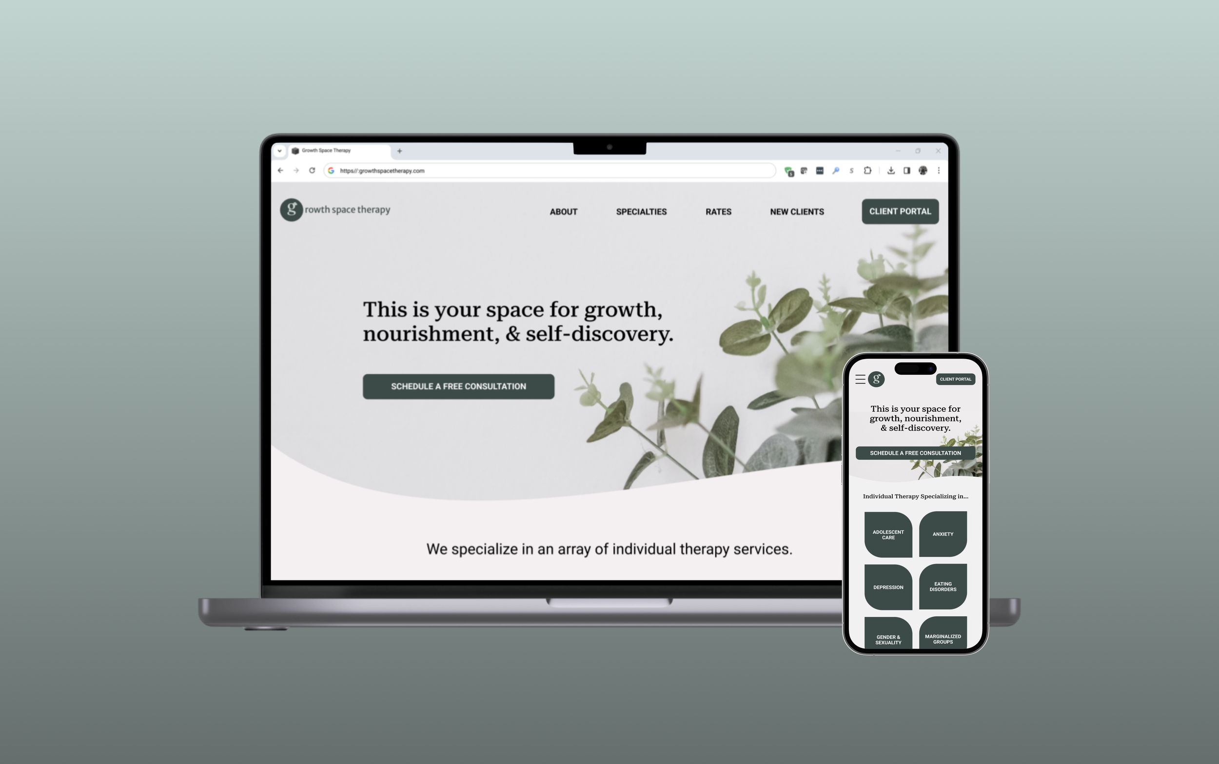 Desktop and mobile designs for V1 of a brand new website for a therapist preparing to launch their own private practice.