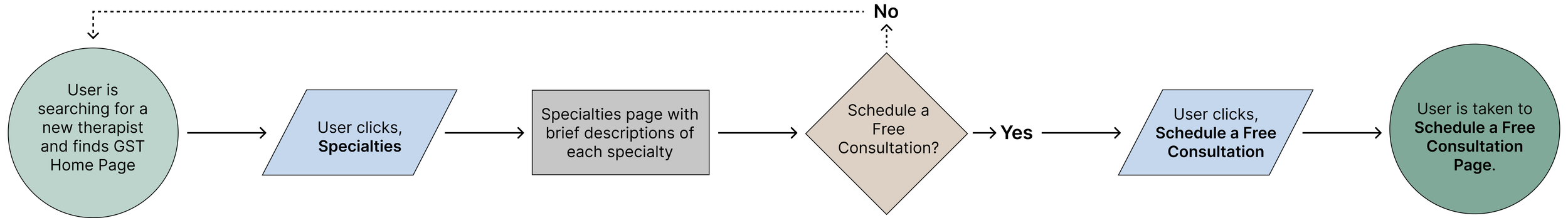 Specialties Page User Flow: User visits the Specialties page and either decides to schedule a consultation or continue browsing.