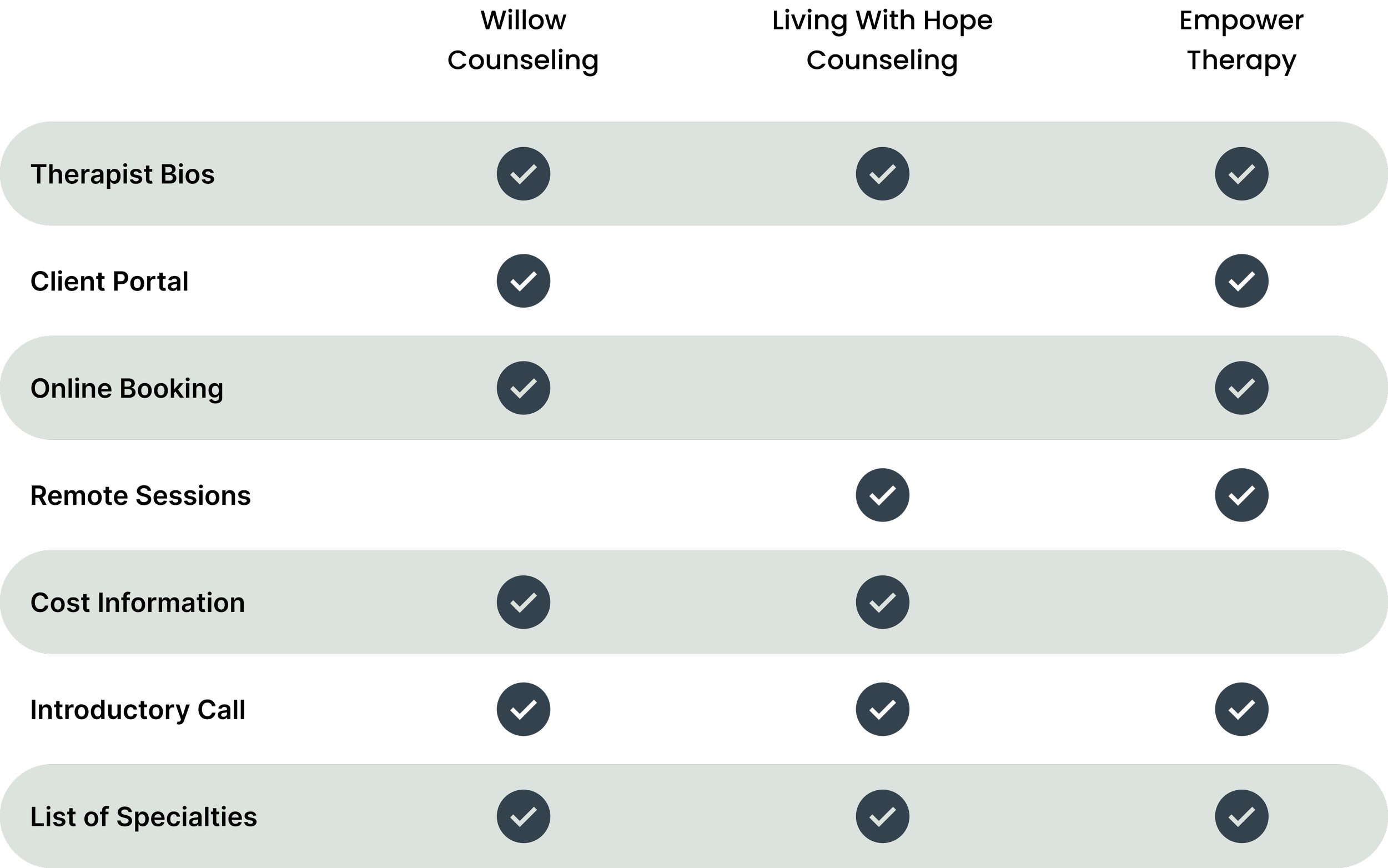 Upon further review of my research notes, I identified best practices and practices to avoid when it comes to designing a website for a therapist’s office.