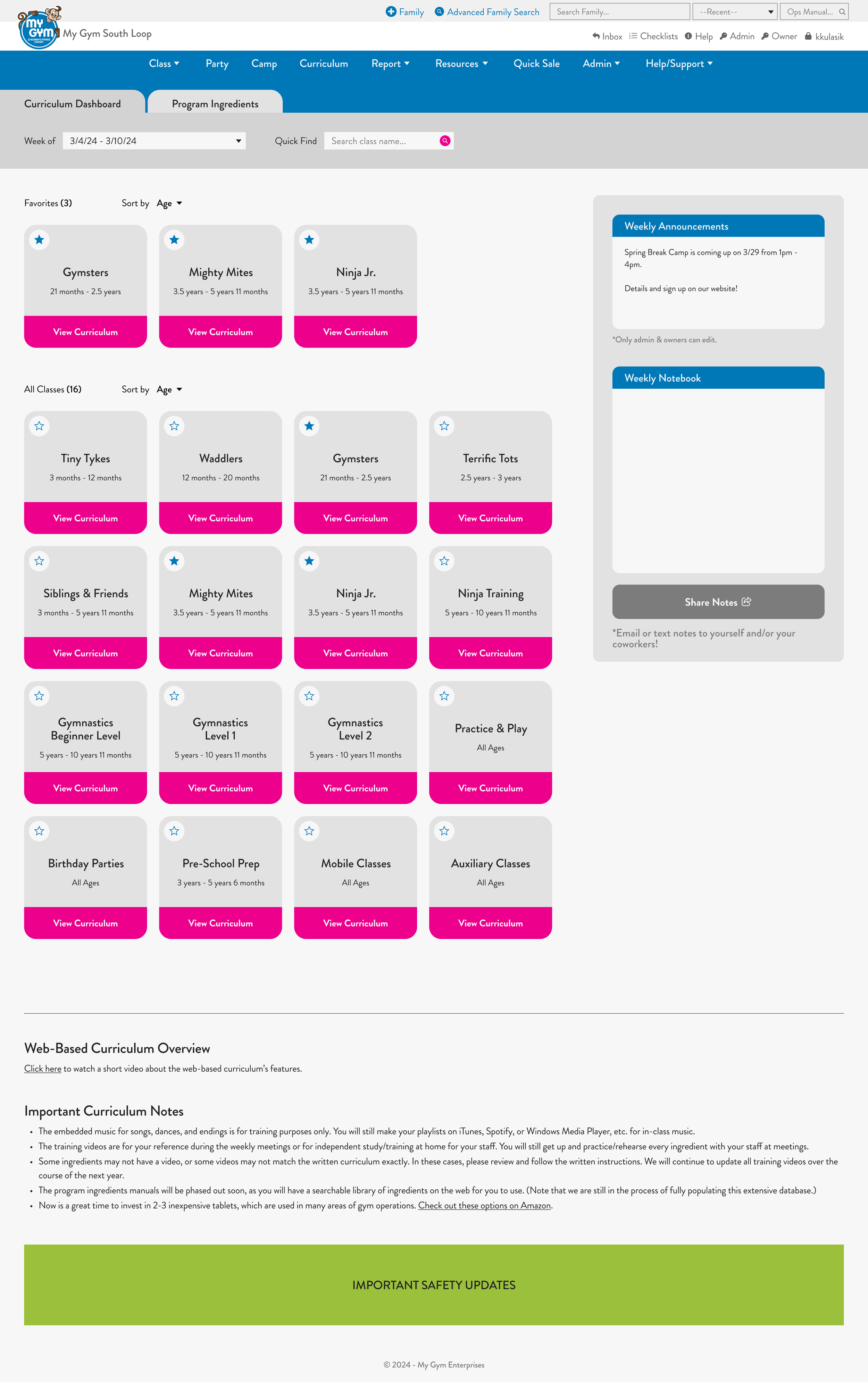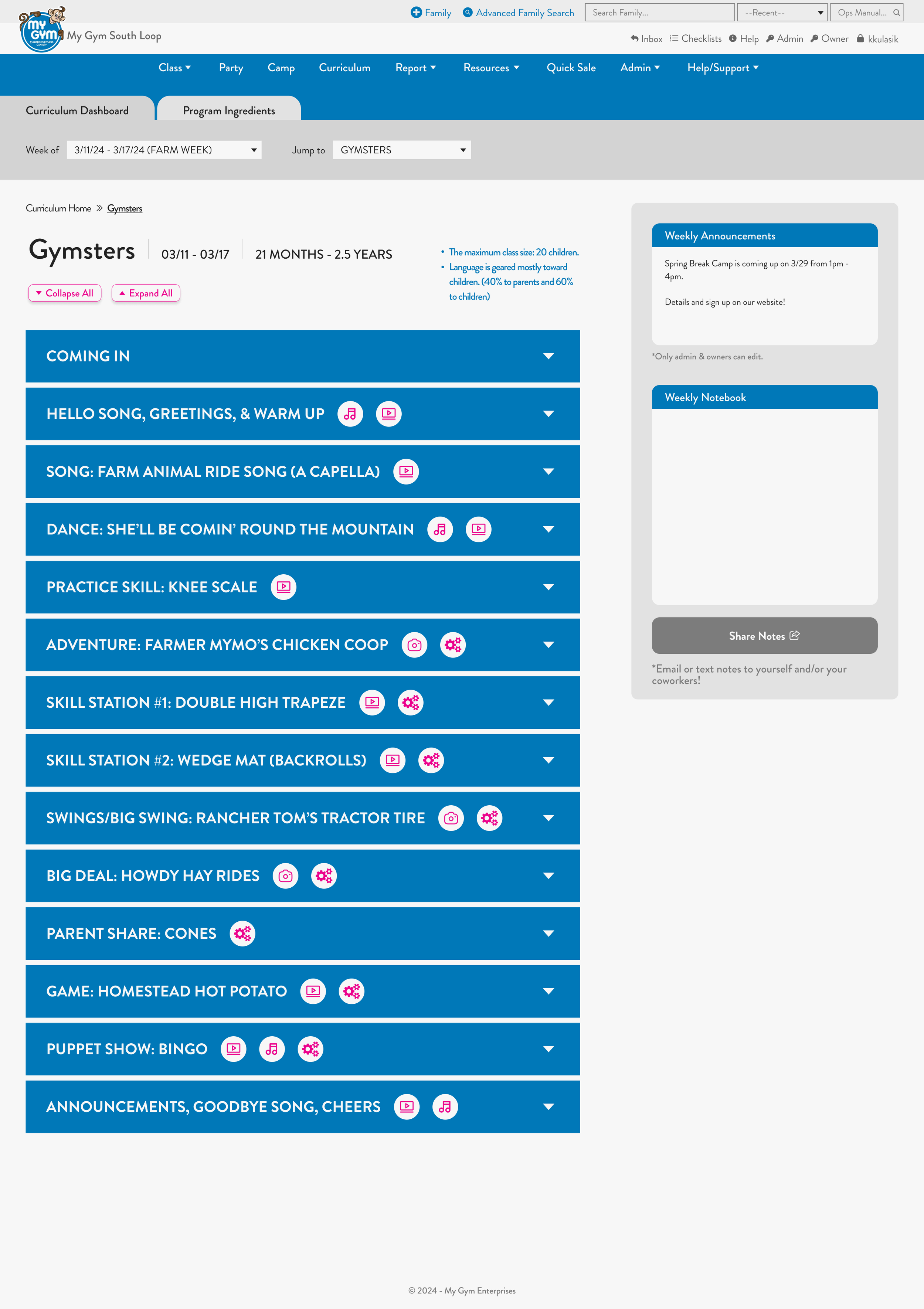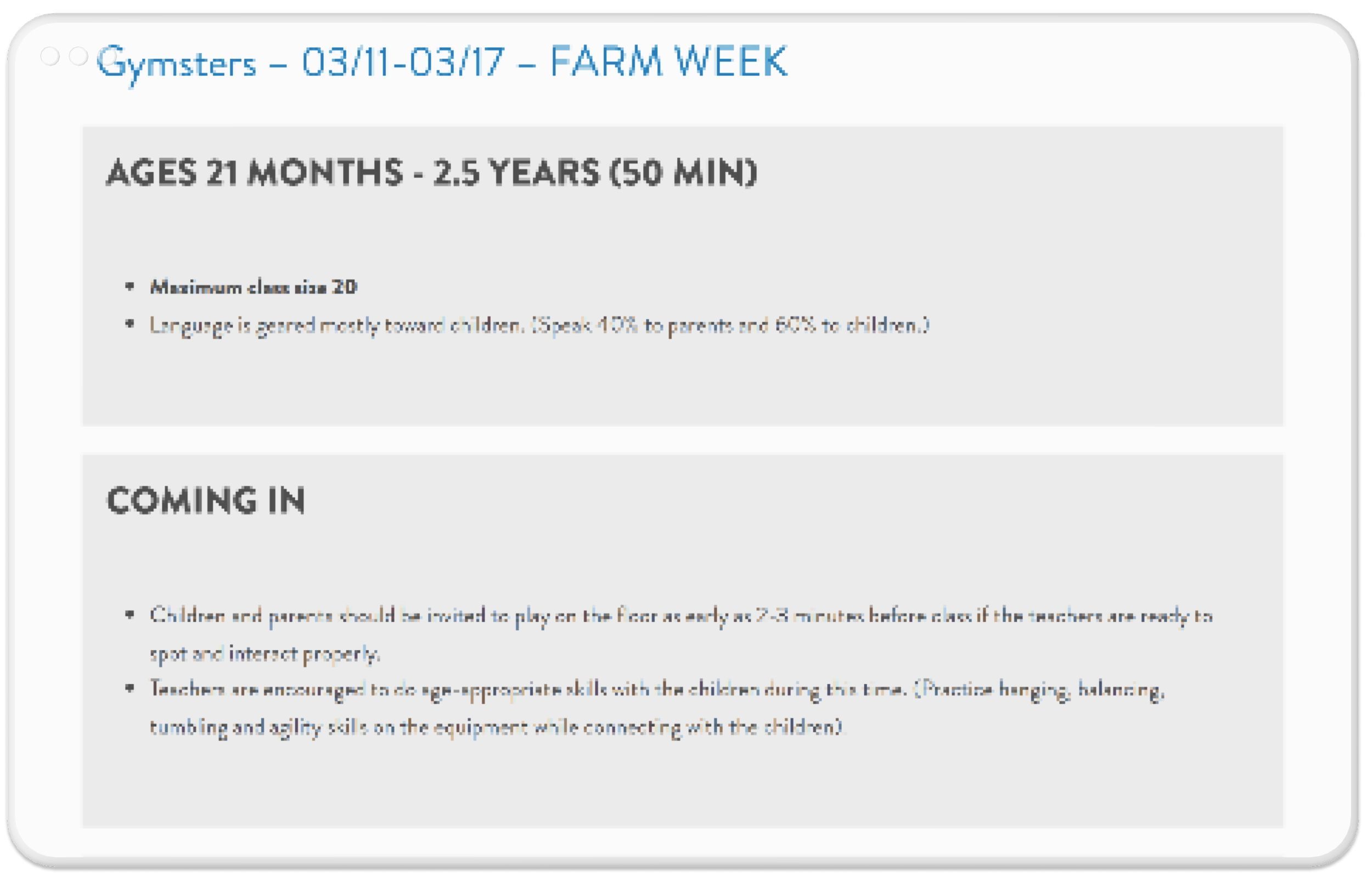 Instructors are expected to lead classes based upon weekly, age-specific curriculums which are posted in the My Gym intranet.