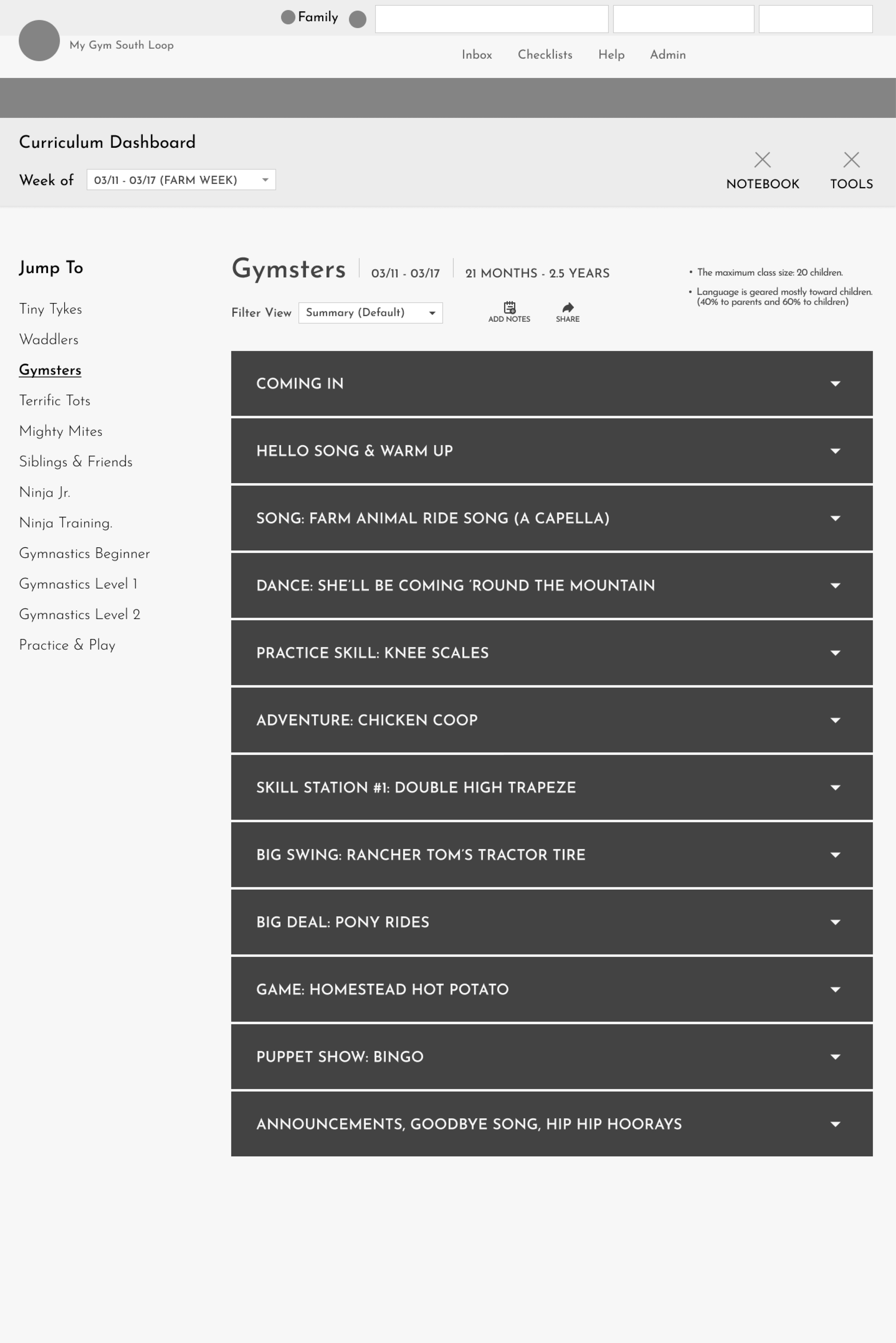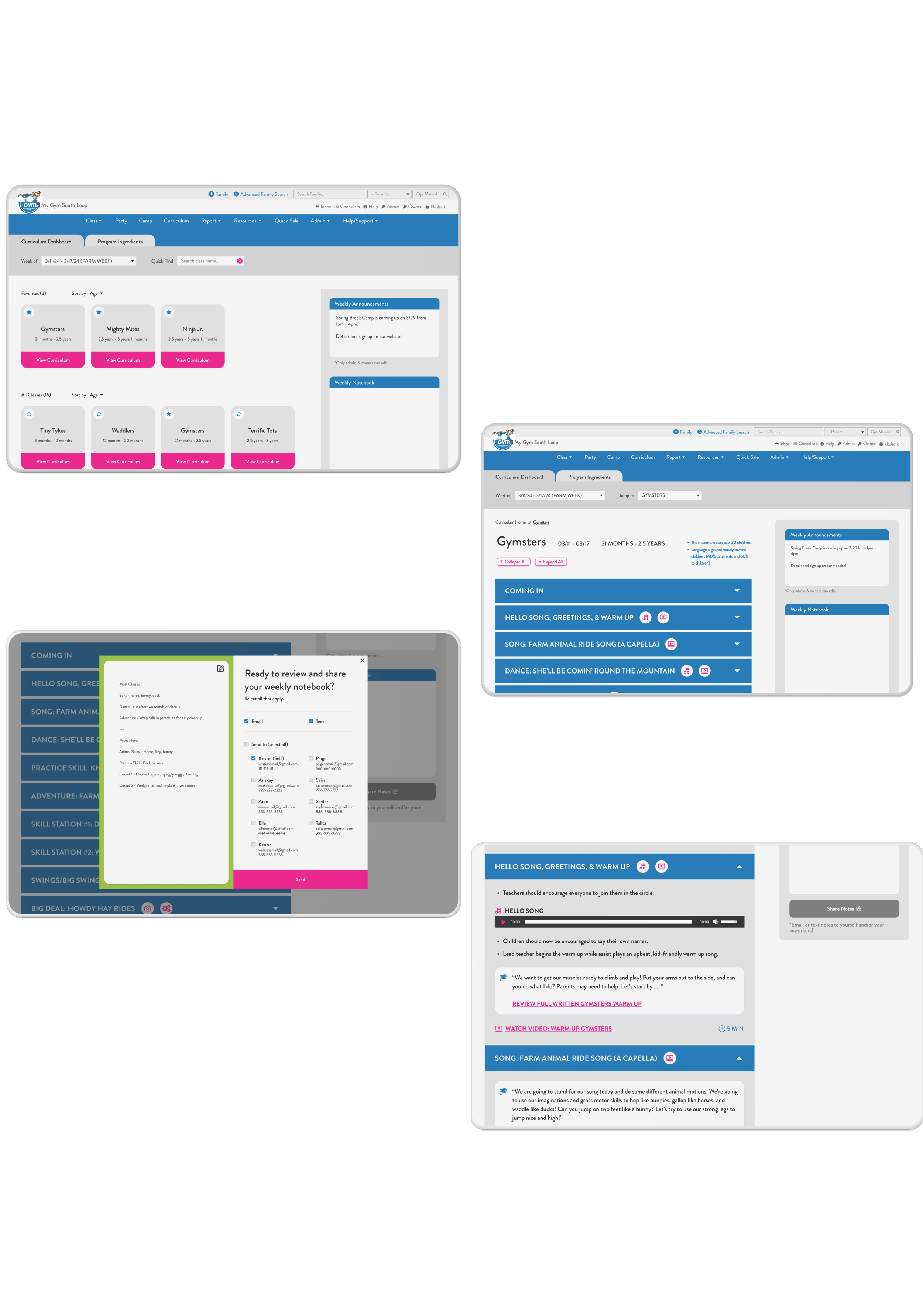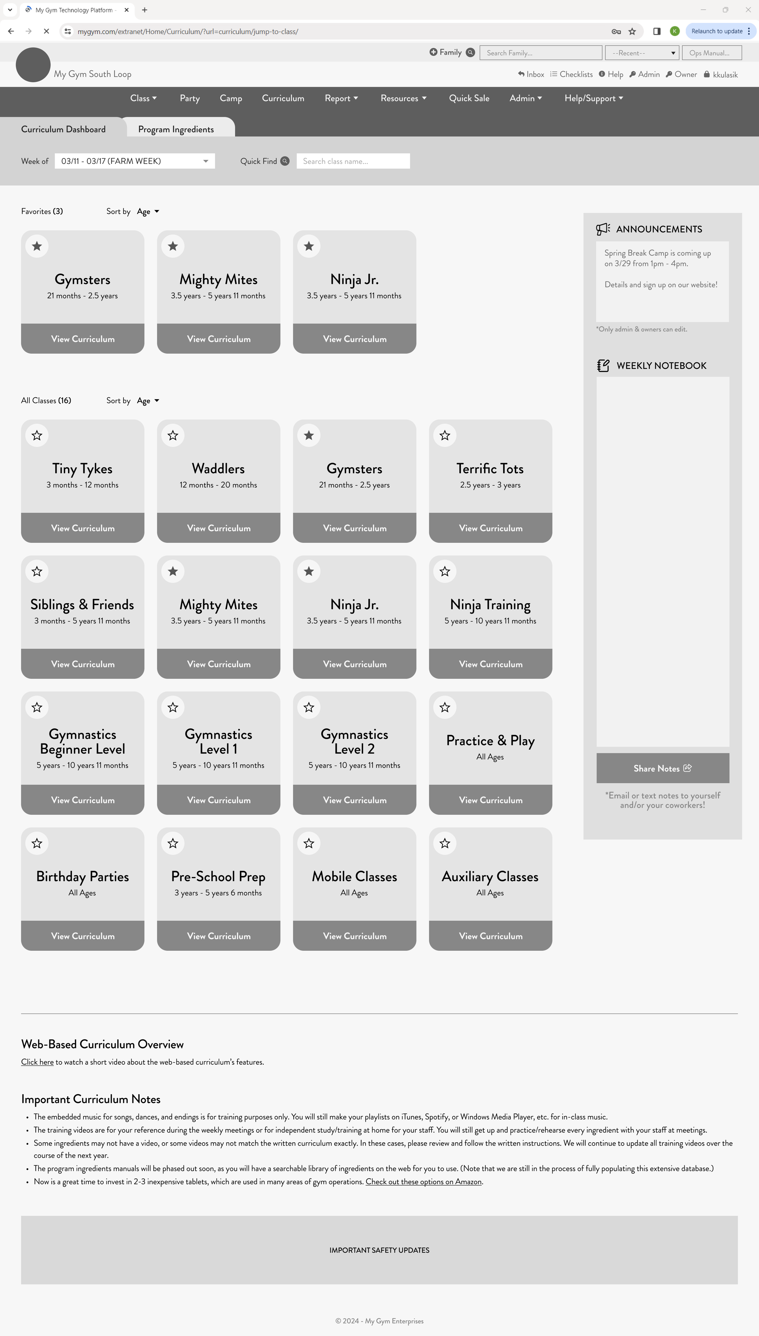Instructors are expected to lead classes based upon weekly, age-specific curriculums which are posted in the My Gym intranet.
