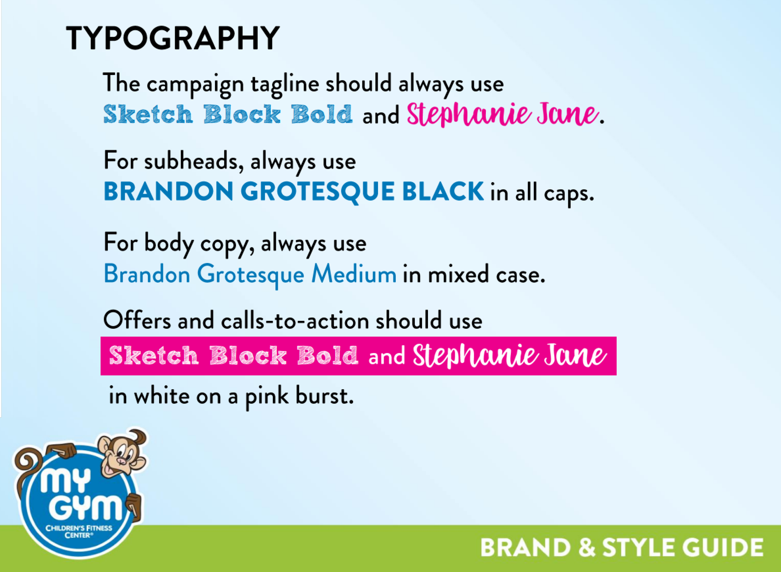 My Gym provided me with their UI Kits for this project. I used the exact HEX numbers in my designs, and I was abe to obtain the Brandon Grotesque fonts.